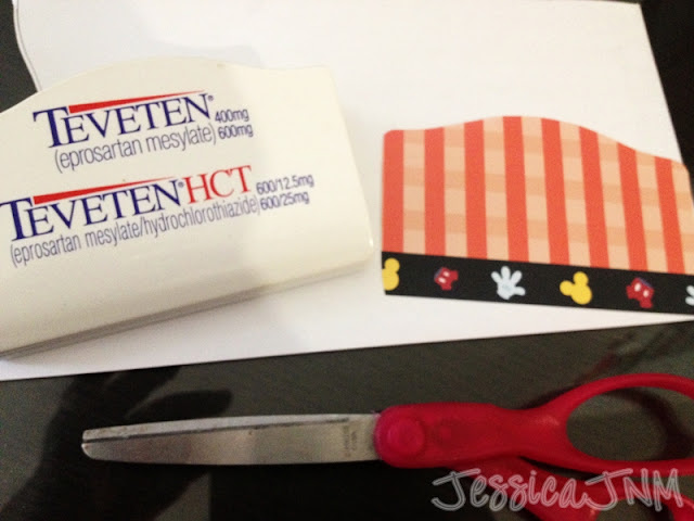 I traced the front of the clip onto a leftover piece of Mickey Mouse scrapbook paper then cut it out. Getting super complicated, right?
